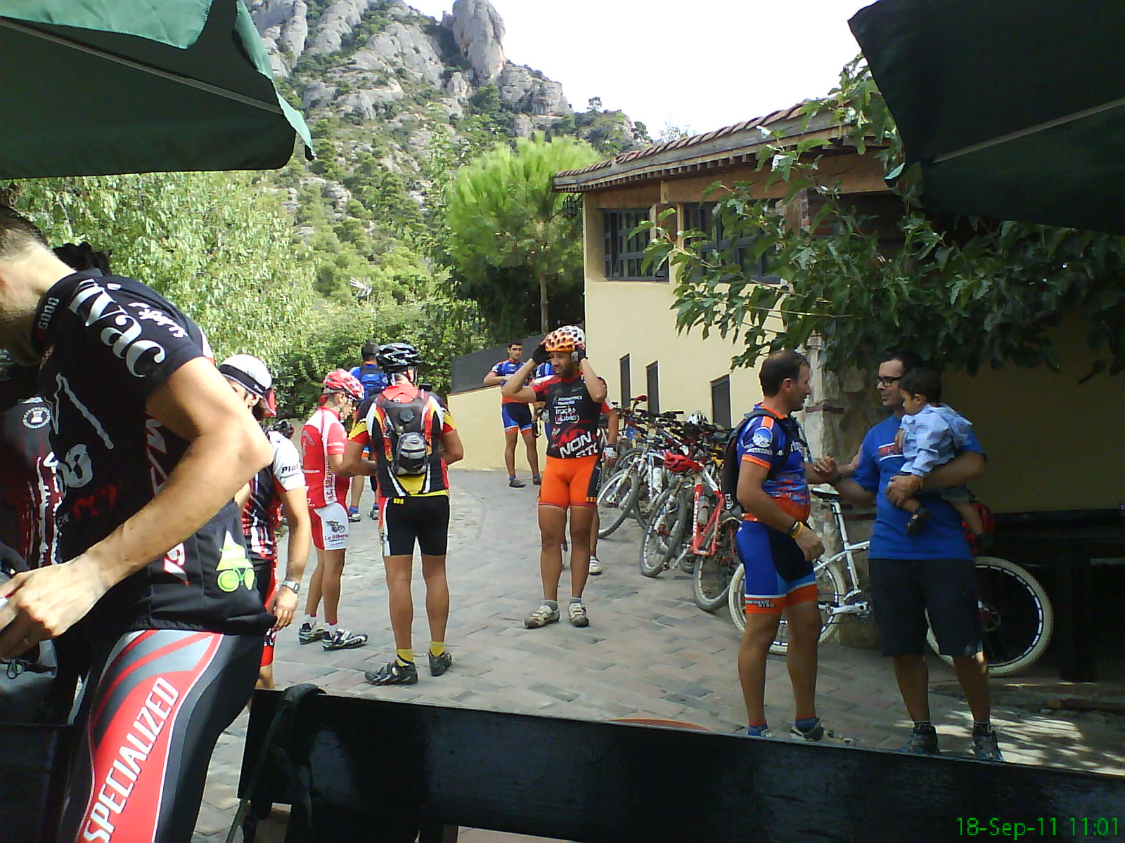 El punto de encuentro, poco a poco se fue convirtiendo en un hervidero de guerreros sedientos de sangre sudor y kilómetros. Todos teníamos muchas ganas de conocernos, así que después de las presentaciones partimos hacia los Blaus. Allí los líderes de la manada, Castillo y Estarqui impusieron un ritmo infernal que hizo que en Esparreguera tuviéramos que esperar un rato a los rezagados. A partir de ese momento moderaron el ritmo y seguimos subiendo. De punta a punta del pelotón íbamos contando nuestras batallitas y nos íbamos conociendo cada vez mejor. La concordia reinaba en el grupo aunque poco a poco y a medida que íbamos superando los repechones de la zona del chocolate y el tótem los estómagos de la tropa iban quejándose cada vez más. Ya en el Bruc solo quedaba la parte del Slalom pero los guerreros ya estaban hambrientos; los habitantes del lugar corrían peligro, sobre todo las féminas, así que decidimos ir rápidos hacia la Vinyanova, donde nos recibieron con un banquete digno de reyes donde saciamos nuestro apetito y donde explotó el júbilo y la lujuria. La posadera a la vez que nos admiraba por nuestra virilidad nos temía por nustro ímpetu y boracidad. Lo pasamos en grande y vivimos momentos inolvidables. Ya solo quedaba bajar por los italianos y la emotiva despedida que sólo es un hasta pronto, porque estos guerreros se volverán a ver las caras en grandes batallas.